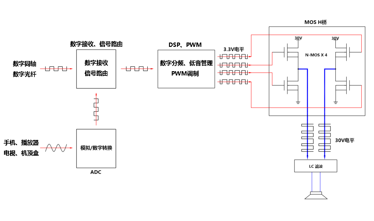 乐之邦音频实验室的纯数字放大器是真正的数字音频放大器,整个放大器的信号链路直到最后的输出电感之前,全部是数字信号,充分保证了放大器的高精度和高保真。纯数字音频放大器可以支持高清音频规格直接放大,在保证声音低失真的同时,可提供高达1000W以上的输出功率。当然,如果配合乐之邦音频实验室的DSD直放技术、数字分频技术,可以让音频功放产品满足HI-END声音素质。