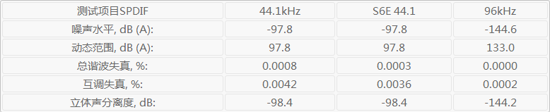 客观测试:言归正传,进入到今天的测评内容。测评内容的客观数据不多,因为06 Plus的设计中Lineout和耳机输出没有区别,所以不再列举。这里主要展示一个S/Pdif下的客观测试成绩,包括在Galaxy S6Edge手机下测得的S/Pdif成绩。