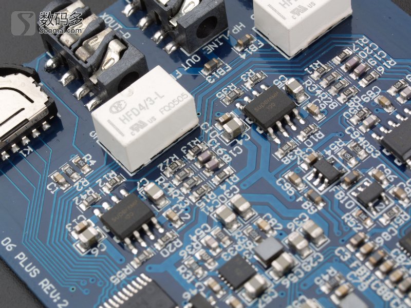 在模拟电路方面,Monitor 06 Plus使用了Onsemi公司的MC33079DG四运放芯片做I/V,使用四运放是为了后面的平衡输出做准备。虽然没有双DAC,但是从I/V开始就是平衡电路。06 Plus没有区分耳机和Lineout,即Lineout也是通过SuperAMP100运放芯片放大输出的。中间的3.5mm非平衡接口是取了平衡输出的一路信号,而双3.5mm的平衡输出,则是在两根线上分别加载了正负电压,对于耳机负载来说没有地线。但是如果要用3.5mm平衡输出转接到XLR平衡接口就比较麻烦,因为没有真正的地线,对于后级输入端来说不能构成真正的平衡输入。但是,通过这个3.5mm接口可以转接为普通RCA接口,此时的RCA两级并非一正一地,而是一正一负,电压值是中间3.5mm非平衡接口输出的两倍。此次乐之邦在模拟电压输出方面比较保守,实测非平衡输出在0dB信号时为1.9Vrms,而平衡输出则是3.8Vrms。
