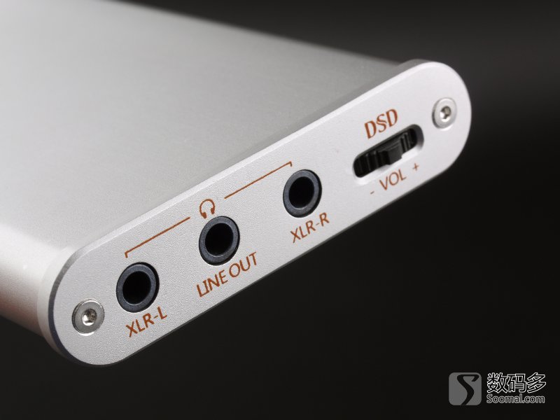 输出接口:在声卡的另外一面,是3个3.5mm接口和一个弹簧滚轮式的数字编码器。正中间的3.5mm接口是一个复合的4段接口,它提供了一组3.5mm非平衡的模拟输出和一个可转接的S/Pdif 同轴数字输出。官方标配了转接线。两边各一个的3.5mm接口是平衡耳机输出,使用了和索尼PHA解码器系列上一样的平衡耳机定义方法。所以去定制转接线和转接头都是比较方便的。官方没有提供平衡耳机线的转接线和转接头,6月份首批预购用户似乎是赠送一根双3.5mm转接4pin XLR的平衡耳机线。这些耳机线去淘宝找一家定制,价格可能在100-500元不等。