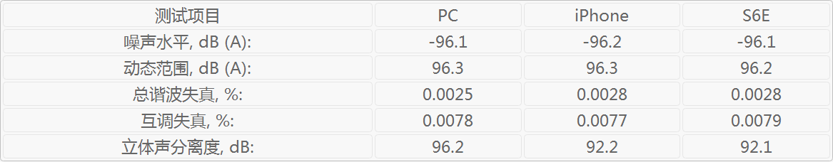 在客观测试中,我们使用无负载下的-10dBV输入规范,配合E-MU 1616m对输入信号进行分析。测试只对3.5mm接口的非平衡输出进行。而至于数字输出部分,会在下一篇测评中再谈。测试在Windows10、macOS10.12、iOS10、Android7下完成。电脑使用Surface Pro4、“带把”的Macbook Pro13,手机为iPhone、iPad Pro12和三星Galaxy S6edge。