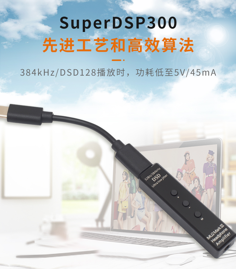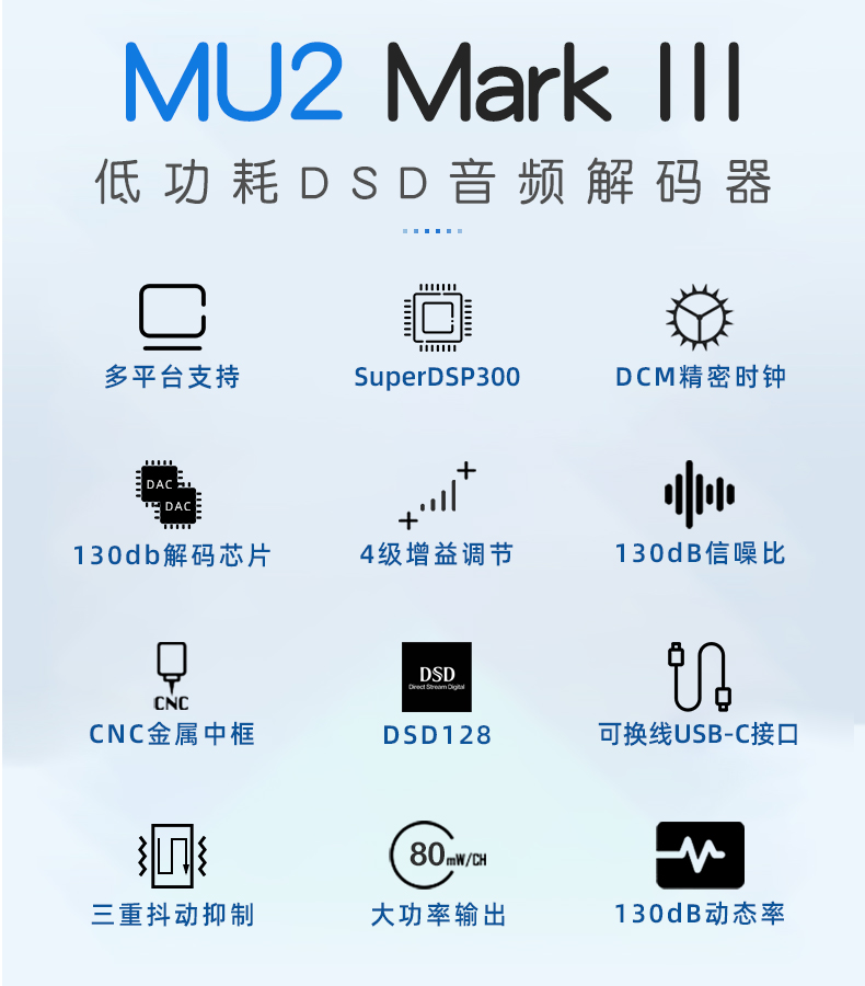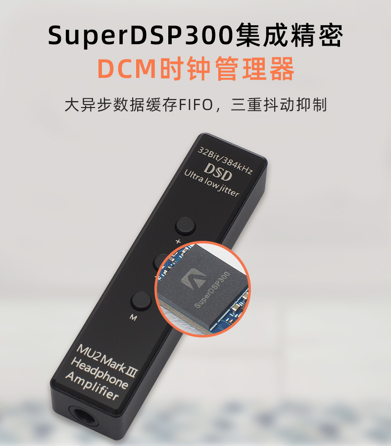 MU2 Mark III 使用了标准版的SuperDSP300处理器,搭配130dB的乐之邦定制版CS43130M解码芯片,配合多路精密电源,让手机秒变HIFI播放器。